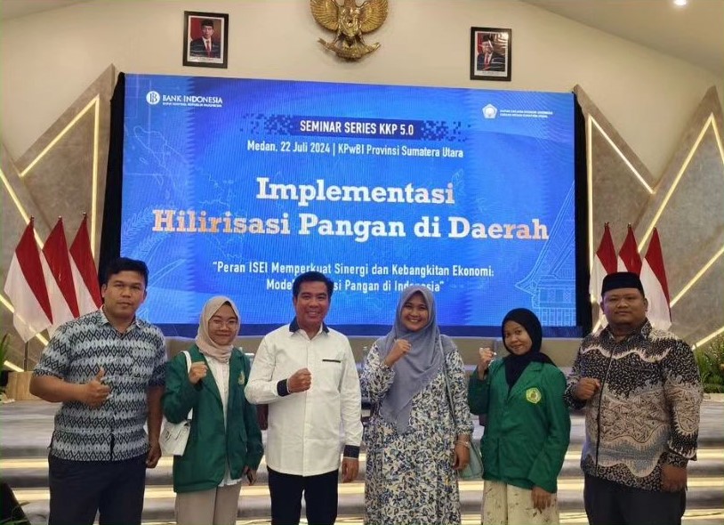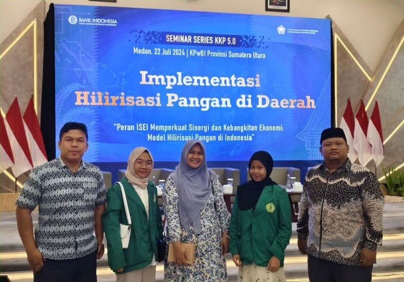 Dosen dan Mahasiswa FEB UMN Al-Washliyah turut serta dalam menghadiri Seminar Series Buku Kajian Kerangka Publik (KKP) 5.0 yang diselenggarakan oleh Kantor Perwakilan Bank Indonesia Provinsi Sumatera Utara berkolaborasi dengan Bank Indonesia Institute dan Ikatan Sarjana Ekonomi Indonesia (ISEI) Cabang Medan. Rangkaian seminar ini merupakan seri ketiga yang dilaksanakan pada Senin, 22 Juli 2024 yang dilaksanakan di Ruang Kuala Deli, Lantai 9 Kantor Perwakilan Bank Indonesia Sumatera Utara, Medan. Kegiatan ini dihadiri oleh 175 peserta secara offline yang terdiri dari perwakilan akademisi (A), pelaku usaha (Business/B) dan Pemerintah Government/G) termasuk 3 dosen dan 2 mahasiswa FEB UMN Al-Washliyah Medan.
