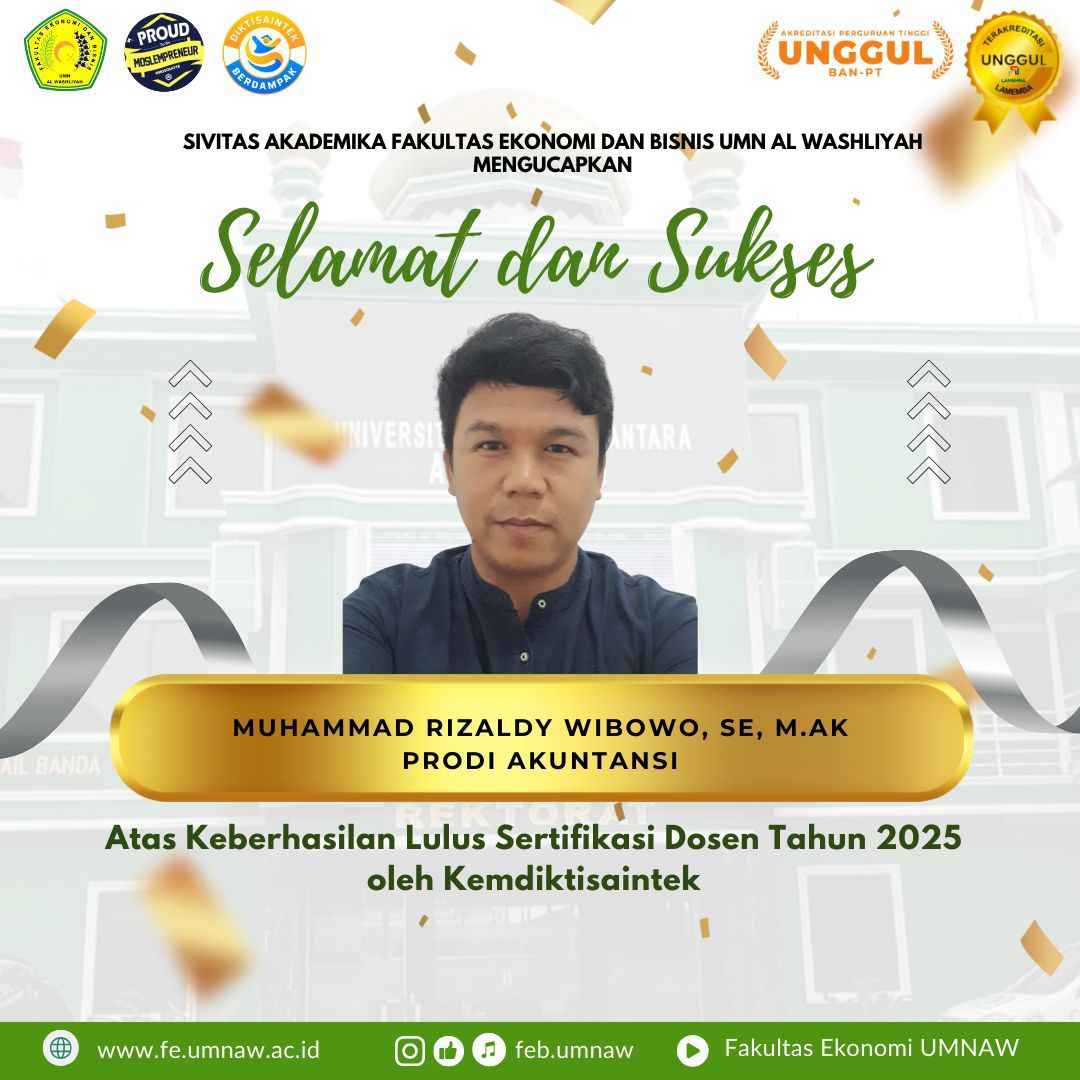 Fakultas Ekonomi dan Bisnis (FEB) Universitas Muslim Nusantara (UMN) Al Washliyah kembali mencatatkan prestasi membanggakan. Salah satu dosen Program Studi Akuntansi, Muhammad Rizaldy Wibowo, SE, M.Ak, berhasil lulus Sertifikasi Dosen (Serdos) Tahun 2025 yang diselenggarakan oleh Kementerian Pendidikan, Kebudayaan, Riset, dan Teknologi melalui Direktorat Jenderal Pendidikan Tinggi, Riset, dan Teknologi (Kemdiktisaintek).