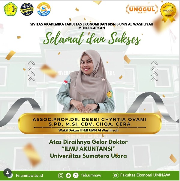 Sivitas Akademika Fakultas Ekonomi dan Bisnis UMN Al Washliyah menyampaikan ucapan Selamat dan Sukses kepada Assoc. Prof. Dr. Debbi Chyntia Ovami, S.Pd., M.Si., CBV., CIIQA., CERA, yang saat ini menjabat sebagai Wakil Dekan II FEB UMN Al Washliyah, atas diraihnya gelar Doktor Ilmu Akuntansi dari Universitas Sumatera Utara pada tanggal 6 November 2025.